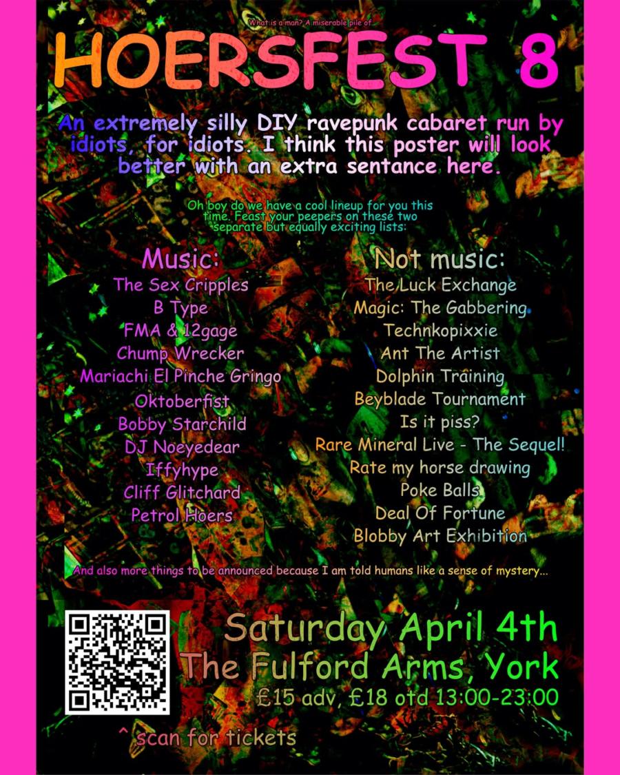 Hoersfest is a delightfully nonsensical DIY ravepunk cabaret that blends high-energy music with bizarre and unpredictable performances. Lovingly curated by the creative mind behind Petrol Hoers, this event is designed to embrace the strange, featuring a lineup of "weird" games and silly sets intended to leave the audience in a state of amused confusion.